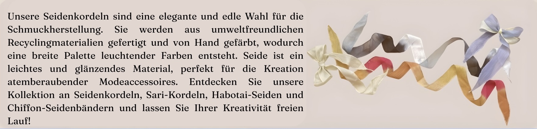 Entdecken Sie unsere Kollektion an Seiden- und Garnmaterialien für den Großhandel, sorgfältig ausgewählt für Schmuckhersteller, Designer und Kreativstudios auf der ganzen Welt. Von Sari Seidei und Seidenbändern zu Seidenkerben, Seidenkordeln, Korkkordeln, und Schmuck Draht, – unser Sortiment vereint Qualität, Flexibilität und wunderschöne Texturen und eignet sich perfekt, um jedem Design eine einzigartige Note zu verleihen.