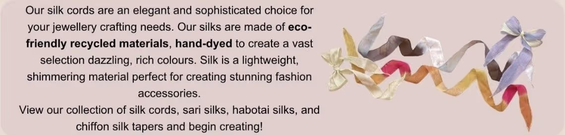 Explore our collection of wholesale silk and stringing materials, carefully selected for jewellery makers, designers, and creative studios across the world. From sari silks and silk ribbons to silk tapers, silk cords, cork cords, and jewellery wire, our range combines quality, flexibility, and beautiful textures, perfect for adding a unique touch to any design.