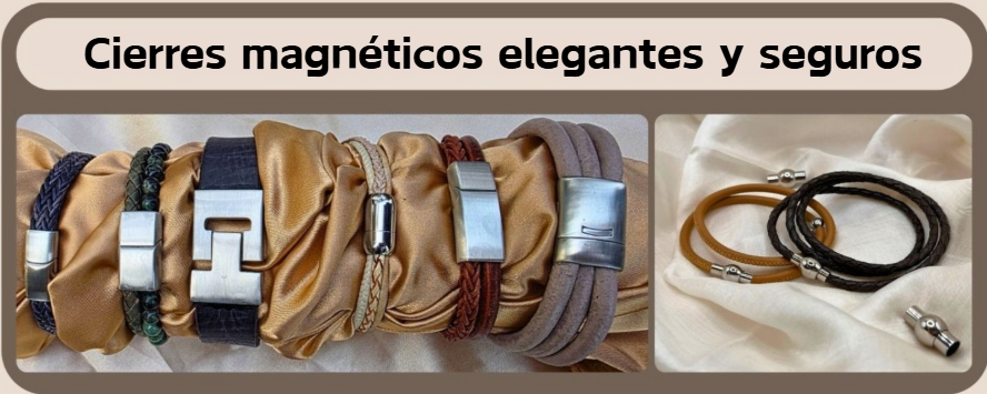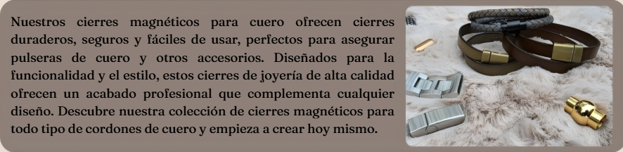 Amplíe su línea de productos con nuestros cierres magnéticos de alta calidad para joyería, diseñados para unir cordones de cuero planos, redondos y Regaliz y crear piezas únicas y sin costuras. Diseñados para uso profesional, estos cierres de alta resistencia ofrecen un cierre seguro y un acabado pulido, ideales para crear pulseras, collares y colecciones de joyería personalizadas.