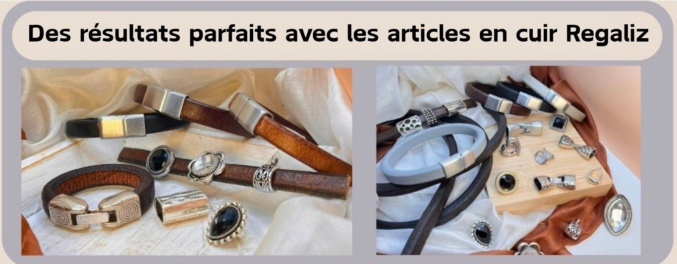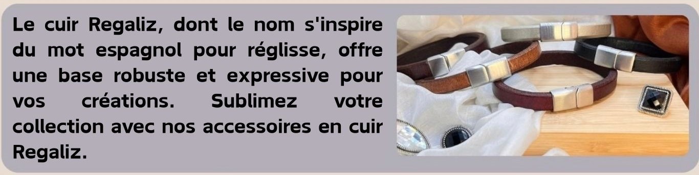 Nos composants en cuir Regaliz subliment bracelets, accessoires et vêtements. Envie de créer vos propres bijoux ? Découvrez nos fermoirs magnétiques et nos connecteurs pour des fermetures originales. Besoin de donner du style à vos cordons unis ? Explorez notre gamme de coulisses et de perles, ainsi que nos embouts, pour une touche d'originalité.