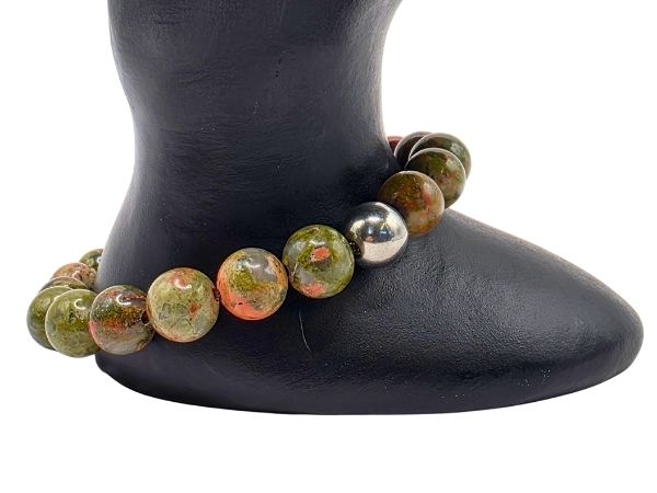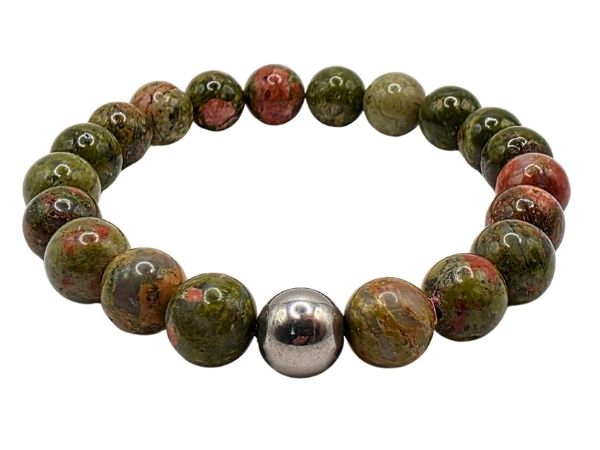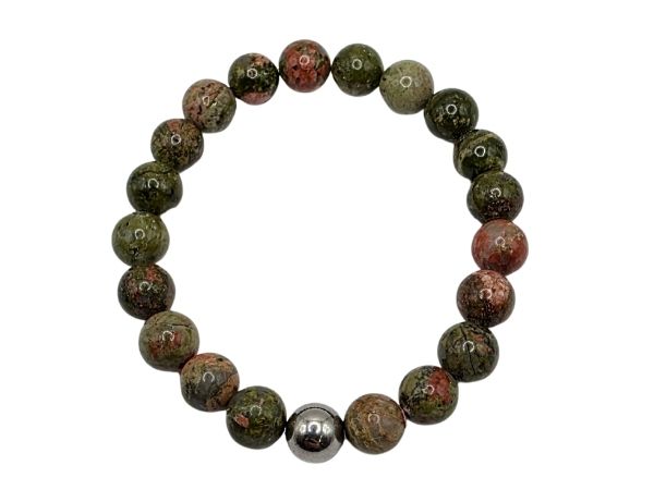 Style 518 is made with our naturally sourced 8mm Unakite stones with a shiny finish, strung together on our elastic thread and accessorized with a shiny steel circular stainless steel bead.
