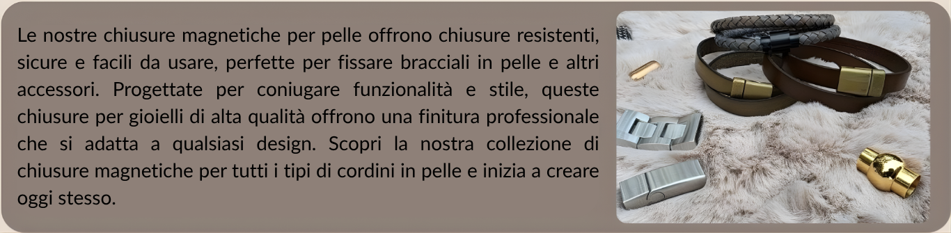 In qualità di fornitore affidabile per aziende orafe, grossisti, artigiani e studi di design, offriamo un'ampia selezione di chiusure magnetiche per cordini in pelle in vari stili, materiali e finiture, per soddisfare ogni esigenza di design. Tutti i componenti sono disponibili in grandi quantità, garantendo una qualità costante e una fornitura affidabile per produzioni su larga scala.